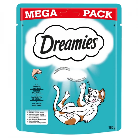 Szeretné elkényeztetni macskáját valamivel? A Dreamies macska jutalomfalat kívülről ropogós és belül krémes és ízletes. A ropogós héjban levő krémes töltelék rendkívül ínycsiklandozó. A praktikus, visszazárható csomagolás frissen tartja a csemegét, hogy kedvencét minden nap újra meg újra kényeztethesse. A Dreamies macskacsemege kevesebb mint 2 kalóriát tartalmaz, ezért lelkiismeret furdalás nélkül kényeztetheti kedvencét. Rázza meg a csomagot és meglátja, hogy macskája oda lesz érte! Etetési útmutató: Max. 20 darab naponta. A napi etetési mennyiségek kialakításakor kérjük vegye figyelembe a jutalomfalat mennyiségét is. Mindig biztosítson friss és tiszta ivóvizet kedvence számára!Etetési útmutató: Max. 20 darab naponta. A napi etetési mennyiség kialakításakor kérjük vegye figyelembe a jutalomfalat mennyiségét is. Ne feledkezzen meg friss ivóvizet biztosítani kedvence számára. Összetétel: hús- és állati származékok, gabonafélék, olajok és zsírok, növényi eredetű származékok, növényi fehérjekivonatok, halak és halszármazékok (beleértve a narancssárga darabokat tartalmazó 4% lazacot és a barna darabokban 4% tonhaltartalmat), ásványi anyagok. Kiegészítők / kg: antioxidánsok és színezékek; Táplálék-adalékanyagok: A-vitamin: 6460 NE, B1-vitamin: 9,9 mg, B2-vitamin: 16,9 mg, B6-vitamin: 4,4 mg, D3-vitamin: 713 NE, E-vitamin: 64,8 mg, Réz-szulfát-pentahidrát: 26,7 mg, Mangán-szulfát-monohidrát: 43,4 mg, kálium-jodid: 2,2 mg, cink-szulfát-monohidrát: 193 mg Analitikai összetevők: Fehérje:32 Zsírtartalom:25 Szervetlen anyag:9 Rost:1,7 Energia: 438Kcal/ 100g
