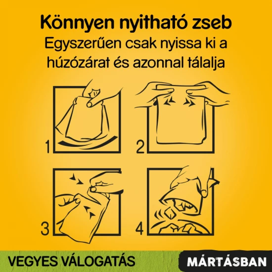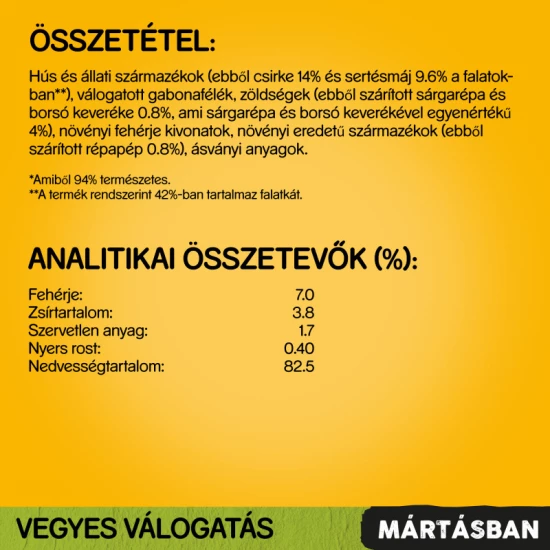 Összetevők: - Csirkével és zöldségekkel: hús és állati származékok (39%, ebből 4% csirke), zöldségek (4% sárgarépa és zöldborsó), válogatott gabonafélék, ásványi anyagok, növényi eredetű származékok (ebből 0,5% szárított répapép), olajok és zsírok (ebből 0,5% napraforgóolaj), növényi fehérje kivonatok - Marhával és zöldségekkel: hús és állati származékok (39%, ebből 4% marha), zöldségek (4% sárgarépa és zöldborsó), válogatott gabonafélék, ásványi anyagok, növényi eredetű származékok (ebből 0,5% szárított répapép), olajok és zsírok (ebből 0,5% napraforgóolaj), növényi fehérje kivonatok Analitikai összetevők: Fehérje 7%, zsír 6%, szervetlen anyag 2% nyersrost 0,3%, nedvesség 82,5%, kalcium 0,35%. Tápértékkel rendelkező adalékanyagok: D3-vitamin 150 NE, E-vitamin 50 mg, kalcium-jodád (vízmentes) 0,39 mg, réz-szulfát pentahidrát 5,7 mg, vas-szulfát monohidrát 10mg, mangán-szulfát monohidrát 5,6 mg, cink-szulfát monohidrát 107 mg. Etetési útmutató: Étrendváltáskor érdemes bizonyos átállási időt hagyni, hogy kedvence alkalmazkodjon az új eledelhez. Az etetési mennyiség és a napi etetések kialakításakor vegye figyelembe kutyája igényét. Mindig gondoskodjon megfelelő mennyiségű ivóvízről kedvence számára. Szobahőmérsékleten tálalva a legfinomabb.
