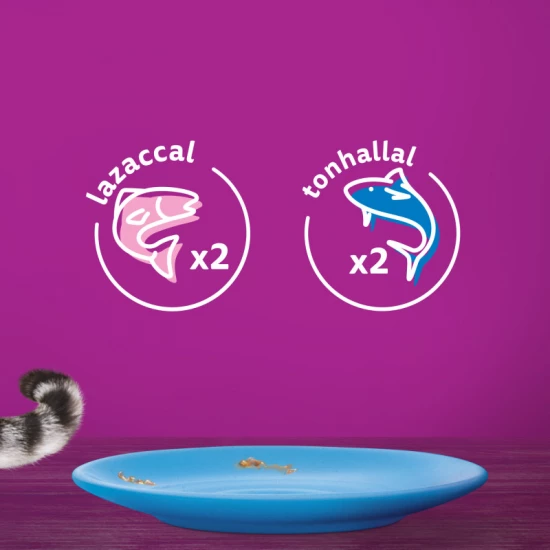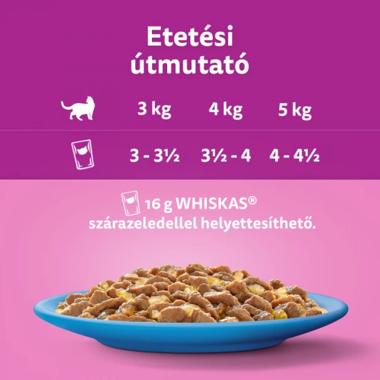 Whiskas alutasak 4-pack halas aszpikban 4x85g Macskarajongókként tudjuk, hogy a dorombolás a legcsodásabb hang, amit csak hallhatunk. Ezért macskaséfjeink keményen dolgoznak azon, hogy olyan ízletes fogásokat készítsenek, amelyek miatt világszerte macskák milliói rohannak a tálkájukhoz izgatottan dorombolva, és elégedetten nyalogatva a bajszukat. Mindegyik fogás szeretettel és gondosan készül, és kiegyensúlyozott tápanyagtartalmuk biztosítja, hogy macskája mindent megkapjon, amire szüksége van a dorombolás folytatásához. Kedvenc ételeinket speciálisan készítjük el, hogy megőrizzék a kiváló minőségű összetevők természetesen jótékony hatásait és finom ízeit, melyekért macskája gyorsabban szalad majd a tálkájához mint valaha! Ízletes receptjeinket úgy alkottuk meg, hogy minden cicát dorombolásra késztessenek. Az étkezések idején, és azon túl is... Minden ízletes recept 100%-ban kiváló minőségű összetevőkből készül, és úgy lett megalkotva, hogy 100%-ban biztosítsa az 1+ éves macskák napi szükségleteit. 2. Kiváló minőségű fehérjét tartalmaz az erős izmok támogatására. 3. C-vitamint tartalmaz, amely segíti a természetes védekezést. 4. Cinket tartalmaz, amely elengedhetetlen az egészséges bőrhöz és szőrhöz. 5. Elkötelezettek vagyunk környezeti hatásaink csökkentése mellett. A receptjeinkben használt halak fenntartható forrásból származnak. Etetési útmutató A napi szükséglet 3 kg-os macska esetén 3 - 31 tasak, 4 kg-os macska esetén 31 - 4 tasak, 5 kg-os macska esetén 4 - 41 tasak. 1 tasak 16 g WHISKAS® szárazeledellel helyettesíthető. Számolja a jutalomfalatokból származó kalóriát. Az etetési mennyiség kialakításakor vegye figyelembe macskája igényét. Hogyan? Látogasson el weboldalunkra. Kínáljon hozzá friss vizet. Szobahőmérsékleten tálalva a legfinomabb, felbontástól számítva 2 napig hűtve eltartható. Összetétel: hús és állati származékok (33%), hal és halszármazékok (ebből 4% lazac a falatokban*), válogatott gabonafélék, ásványi anyagok, növényi eredetű származékok, különféle cukrok. Adalékanyagok/kg:Tápértékkel rendelkező adalékanyagok:C-vitamin:702mg, taurin:620mg, Réz (Réz(II)-szulfát-pentahidrát):1.2mg, Jód (Kalcium-jód, kötött vizet nem tartalmazó):0.22mg, Vas (Vas(II)-szulfát, monohidrát):11.2mg, Mangán (Mangán-szulfát, monohidrát):2.2mg, Cink (Cink-szulfát, monohidrát):16.2mg/Technológiai adalékanyagok:kasszia gumi:2148mg/Aromák. Analitikai összetevők (%):fehérje:7.8;zsírtartalom:4.0;szervetlen anyag:1.6;nyers rost:0.25;nedvességtartalom:84.5.