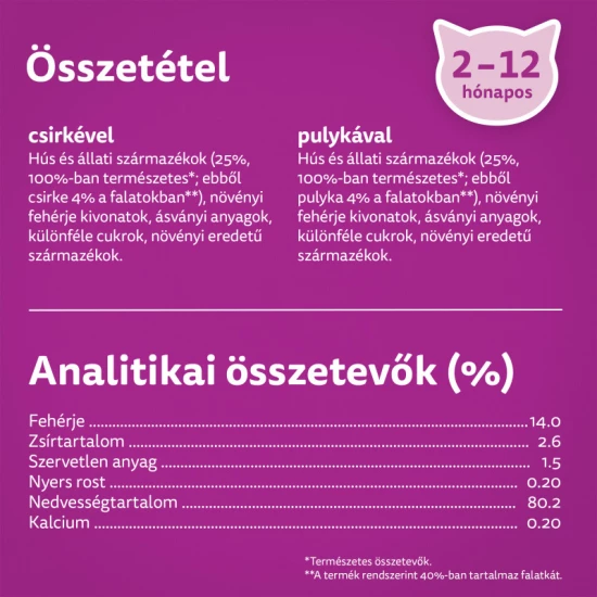 Összetevők: - Csirkével: hús és állati származékok (22%, ebből 4% csirke), növényi fehérje kivonatok, különféle cukrok, ásványi anyagok - Kacsával: hús és állati származékok (22%, ebből 4% kacsa), növényi fehérje kivonatok, különféle cukrok, ásványi anyagok - Baromfival: hús és állati származékok (22%, ebből 4% baromfi), növényi fehérje kivonatok, különféle cukrok, ásványi anyagok - Pulykával: hús és állati származékok (22%, ebből 4% pulyka), növényi fehérje kivonatok, különféle cukrok, ásványi anyagok Analitikai összetevők: Fehérje 12,5%, zsír 2,5%, szervetlen anyag 1,2%, nyersrost 0,2%, nedvesség 83%. Tápértékkel rendelkező adalékanyagok: B1-vitamin 29,4 mg, D3-vitamin 250 NE, E-vitamin 19,6mg, kalcium-jodát (vízmentes) 0,44 mg, réz-szulfát pentahidrát 6 mg, vas-szulfát monohidrát 46,67 mg, mangán-szulfát monohidrát 8,75 mg, cink-szulfát monohidrát 61,54 mg. Technológiai adalékanyagok: Kasszia gumi 2800 mg. Etetési útmutató: Étrendváltáskor érdemes bizonyos átállási időt hagyni, hogy kedvence alkalmazkodjon az új eledelhez. Az etetési mennyiség kialakításakor vegye figyelembe macskája igényét. Átlagosnál nagyobb testsúlyú macska esetében csökkentse a napi etetési mennyiséget. Mindig gondoskodjon megfelelő mennyiségű ivóvízről kedvence számára. Szobahőmérsékleten tálalva a legfinomabb.