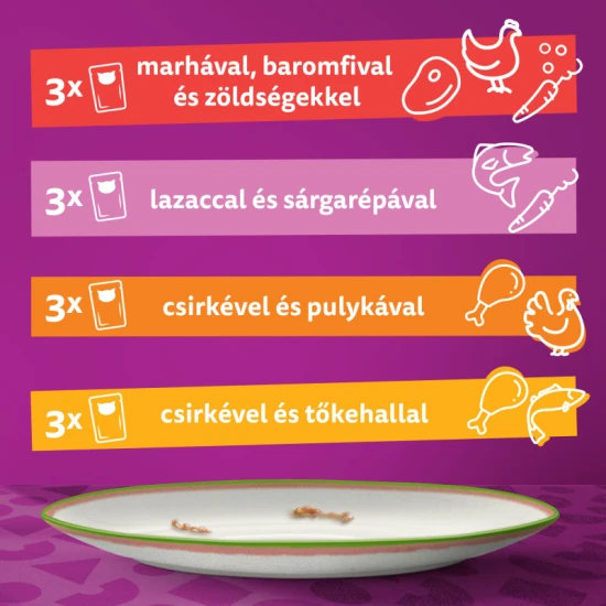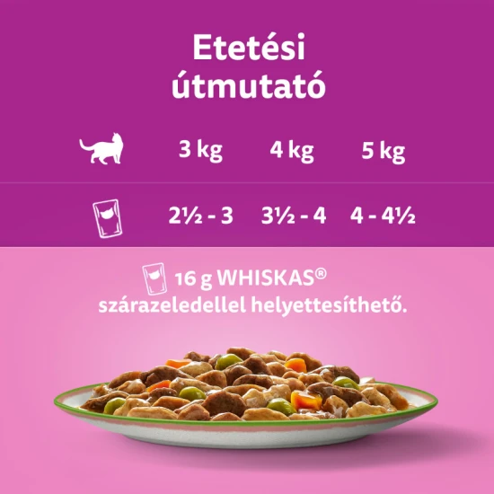 Fehérjék és zöldségek ízletes ízélményt nyújtó kombinációja egy kellemes mixben, amely garantálja, hogy a cicák dorombolni fognak. Minden, amire macskájának szüksége van, hogy megőrizze egészségét, beleértve a B-vitaminokat és a kiegyensúlyozott arányú ásványi anyagokat. Négy szenzációs receptet tartalmaz, melyeket macskaséfjeink válogattak ki: marha baromfi kerti zöldségekkel, lazac sárgarépa, csirke fehérhal, fehérhal kerti zöldségek. Minden ízletes étkezés 100%-ban biztosítja macskája napi szükségleteit. Elkötelezettek vagyunk környezeti hatásaink csökkentése mellett. A receptjeinkben használt halak fenntartható forrásból származnak. Etetési útmutató: A napi szükséglet 3 kg-os macska esetén 21 – 3 tasak, 4 kg-os macska esetén 31 – 4 tasak, 5 kg-os macska esetén 4 – 41 tasak. 1 tasak 16 g WHISKAS® szárazeledellel helyettesíthető. Számolja a jutalomfalatokból származó kalóriát. Az etetési mennyiség kialakításakor vegye figyelembe macskája igényét. Hogyan? Látogasson el weboldalunkra. Kínáljon hozzá friss vizet. Szobahőmérsékleten tálalva a legfinomabb, felbontástól számítva 2 napig hűtve eltartható. Összetétel: hús és állati származékok (34%, ebből 4% marha és 4% baromfi a falatokban*), válogatott gabonafélék, zöldségek (ebből szárított borsó és sárgarépa keveréke 1%, ami borsó és sárgarépa keverékével egyenértékű 4%), növényi eredetű származékok, ásványi anyagok, növényi fehérje kivonatok, különféle cukrok. *A termék rendszerint 40%-ban tartalmaz falatkát. Összetétel: hús és állati származékok (32%), hal és halszármazékok (ebből 4% lazac a falatokban*), válogatott gabonafélék, növényi eredetű származékok, zöldségek (ebből szárított sárgarépa 0.6%, ami egyenértékű sárgarépával 4%), ásványi anyagok, növényi fehérje kivonatok, különféle cukrok. *A termék rendszerint 40%-ban tartalmaz falatkát. Összetétel: hús és állati származékok (34%, ebből 4% csirke és 4% pulyka a falatokban*), válogatott gabonafélék, növényi eredetű származékok, ásványi anyagok, növényi fehérje kivonatok, különféle cukrok. *A termék rendszerint 40%-ban tartalmaz falatkát. Összetétel: hús és állati származékok (32%, ebből 4% csirke a falatokban*), hal és halszármazékok (ebből 4% tőkehal a falatokban*), válogatott gabonafélék, növényi eredetű származékok, ásványi anyagok, növényi fehérje kivonatok, különféle cukrok. *A termék rendszerint 40%-ban tartalmaz falatkát. Analitikai összetevők (%): fehérje:7.3;zsírtartalom:4.2;szervetlen anyag:1.6;nyers rost:0.25;nedvességtartalom:84.5;kalcium:0.29;foszfor:0.18. Adalékanyagok/kg: Tápértékkel rendelkező adalékanyagok: B1-vitamin:27.3mg, B2-vitamin:1.4mg, B6-vitamin:4.5mg, D3-vitamin:200NE(Hozzáadott D3-vitamint a lazacos és sárgarépás variáns nem tartalmaznak), taurin:620mg, Réz (Réz(II)-szulfát-pentahidrát):1.2mg, Jód (Kalcium-jód, kötött vizet nem tartalmazó):0.22mg, Vas (Vas(II)-szulfát, monohidrát):11.2mg, Mangán (Mangán-szulfát, monohidrát):2.2mg, Cink (Cink-szulfát, monohidrát):16.2mg/íz és aromaanyagok: Aroma.