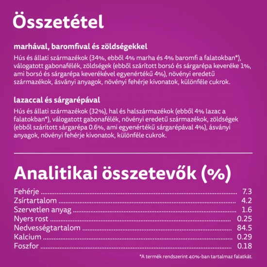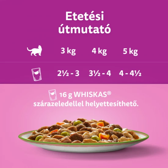 Whiskas alutasak 4-pack Tasty Mix Chef´s choice mártásban 4x85g Macskarajongókként tudjuk, hogy a dorombolás a legcsodásabb hang, amit csak hallhatunk. Ezért macskaséfjeink keményen dolgoznak azon, hogy olyan ízletes fogásokat készítsenek, amelyek miatt világszerte macskák milliói rohannak a tálkájukhoz izgatottan dorombolva, és elégedetten nyalogatva a bajszukat. Mindegyik fogás szeretettel és gondosan készül, és kiegyensúlyozott tápanyagtartalmuk biztosítja, hogy macskája mindent megkapjon, amire szüksége van a dorombolás folytatásához. Üdvözöljük ízletes receptjeink világában, amelyek ínycsiklandó hozzávalók keverékét tartalmazzák, és úgy kényeztetik a macskák érzékeit, hogy közben nem kötnek kompromisszumot a tápanyagtartalom terén. Az étkezések még soha nem voltak ilyen élvezetesek, sem ilyen doromboldogságosak! Macskák kóstolták és hagyták jóvá. 1. Fehérjék és zöldségek ízletes ízélményt nyújtó kombinációja egy kellemes mixben, amely garantálja, hogy a cicák dorombolni fognak. 2. Minden, amire macskájának szüksége van, hogy megőrizze egészségét, beleértve a B-vitaminokat és a kiegyensúlyozott arányú ásványi anyagokat. 3. Két szenzációs receptet tartalmaz, melyeket macskaséfjeink válogattak ki: marha baromfi kerti zöldségekkel, lazac sárgarépa. 4. Minden ízletes étkezés 100%-ban biztosítja macskája napi szükségleteit. 5. Elkötelezettek vagyunk környezeti hatásaink csökkentése mellett. A receptjeinkben használt halak fenntartható forrásból származnak. Etetési útmutató: A napi szükséglet 3 kg-os macska esetén 21 - 3 tasak, 4 kg-os macska esetén 31 - 4 tasak, 5 kg-os macska esetén 4 - 41 tasak. 1 tasak 16 g WHISKAS® szárazeledellel helyettesíthető. Számolja a jutalomfalatokból származó kalóriát. Az etetési mennyiség kialakításakor vegye figyelembe macskája igényét. Hogyan? Látogasson el weboldalunkra. Kínáljon hozzá friss vizet. Szobahőmérsékleten tálalva a legfinomabb, felbontástól számítva 2 napig hűtve eltartható. Összetétel:hús és állati származékok (34%, ebből 4% marha és 4% baromfi a falatokban*), válogatott gabonafélék, zöldségek (ebből szárított borsó és sárgarépa keveréke 1%, ami borsó és sárgarépa keverékével egyenértékű 4%), növényi eredetű származékok, ásványi anyagok, növényi fehérje kivonatok, különféle cukrok. *A termék rendszerint 40%-ban tartalmaz falatkát. Összetétel:hús és állati származékok (32%), hal és halszármazékok (ebből 4% lazac a falatokban*), válogatott gabonafélék, növényi eredetű származékok, zöldségek (ebből szárított sárgarépa 0.6%, ami egyenértékű sárgarépával 4%), ásványi anyagok, növényi fehérje kivonatok, különféle cukrok. *A termék rendszerint 40%-ban tartalmaz falatkát. Analitikai összetevők (%):fehérje:7.3;zsírtartalom:4.2;szervetlen anyag:1.6;nyers rost:0.25;nedvességtartalom:84.5;kalcium:0.29;foszfor:0.18. Adalékanyagok/kg:Tápértékkel rendelkező adalékanyagok:B1-vitamin:27.3mg, B2-vitamin:1.4mg, B6-vitamin:4.5mg, D3-vitamin:200NE(Hozzáadott D3-vitamint a halas variánsok nem tartalmaznak), taurin:620mg, Réz (Réz(II)-szulfát-pentahidrát):1.2mg, Jód (Kalcium-jód, kötött vizet nem tartalmazó):0.22mg, Vas (Vas(II)-szulfát, monohidrát):11.2mg, Mangán (Mangán-szulfát, monohidrát):2.2mg, Cink (Cink-szulfát, monohidrát):16.2mg/íz és aromaanyagok:Aroma.