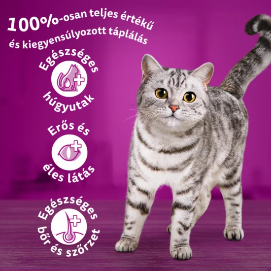 Whiskas Száraz Junior Csirke 1,4kg A WHISKAS® érti, hogy kiscicája mit szeret és természeténél fogva mire van szüksége. Ezért a WHISKAS® Junior eledelt úgy fejlesztettük ki, hogy minden olyan tápanyag benne van, amire kiscicájának szüksége van az egészséges fejlődés érdekében. Ízletes, tejjel töltött falatkákat tartalmaz, melyet kis kedvence élvezni fog és könnyedén el tud ropogtatni. Ízletes jutalomfalatainkat gondosan állítottuk össze, hogy kölyökmacskája a növekedéshez szükséges minden tápanyagot megkaphassa, miközben felfedezi a világot! A kizárólag ellenőrzött beszállítóktól származó, kiváló minőségű összetevőkből készült ízletes receptek a vitaminok és ásványi anyagok tökéletes egyensúlyát biztosítják, hogy boldogok, egészségesek legyenek és minden étkezéskor a tálhoz szaladjanak. • Kalciummal az egészséges csontok és fogak fejlődésének támogatására • Könnyen emészthető csirke az emésztőrendszer támogatására • E-vitaminnal és taurinnal a természetes védekezőképesség támogatásra Olyan gyárakban készült, amelyek megújuló energiát használnak. Összetevők • Válogatott gabonafélék • Hús és állati származékok (4% csirke a barna szemcsékben*) • Növényi eredetű származékok • Olajok és zsírok • Ásványi anyagok • Növényi fehérjé kivonatok • Különféle cukrok • Zöldségek (0,5% szárított sárgarépát tartalmaz (ami 4% sárgarépával egyenértékű) a narancssárga szemcsékben és 1% szárított borsót tartalmaz (ami 4% borsóval egyenértékű) a zöld szemcsékben*) • Tej és tejszármazékok (0,7% sovány tejport tartalmaz a töltött szemcsékben, ami 4% sovány tejjel egyenértékű*) • Élesztők *Barna szemcsék megléte 70%-ban jellemző a termékben, töltött szemcsék esetén 14%, a narancssárga és zöld szemcsék mindkettőjének megléte 8%-ban jellemző a termékben Tápanyagok Analitikai összetevők (%): Fehérje: 35.7 Zsírtartalom: 13.6 Szervetlen anyag: 7.4 Nyers rost: 2.0 Kalcium: 1.5 Foszfor: 0.96 Tápértékkel rendelkező adalékanyagok: A-vitamin: 5955 NE D3-vitamin: 657 NE E-vitamin: 584 mg taurin: 1190 mg Réz (Réz(II)-szulfát-pentahidrát): 7.1 mg Jód (Kálium-jód): 1.8 mg Mangán (Mangán-szulfát, monohidrát): 8.8 mg Szelén (Nátrium-szelenit): 0.05 mg Cink (Cink-szulfát, monohidrát): 26.8 mg